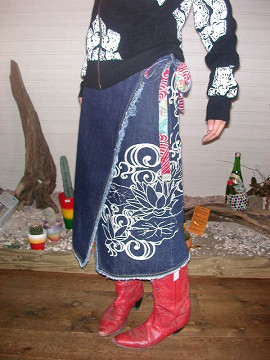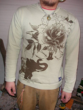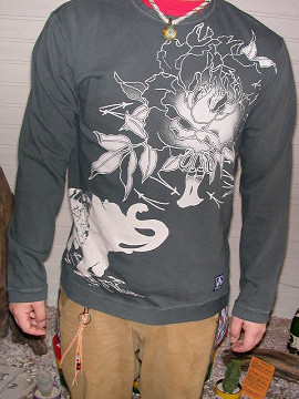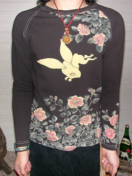 チキリヤの作品は、絵師増田真知子が描く独特な絵柄が特長です。大胆な構図を活かす為、袖や脇の境にかけて描かれる場合もあります。1点1点手作業による加工の為、その際に生じる色むらや色落ちは“味”としてご理解頂き、お楽しみ頂ければ幸いです。このページでは取り扱っている商品を画像で紹介をしています。ご希望の商品がございましたら下のボタンをクリックして下さい。注文等を行えるショッピングページに進みます。
